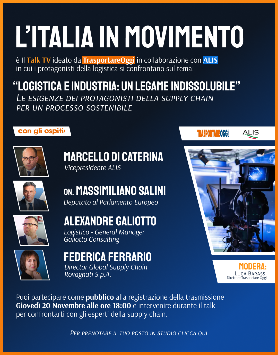 Trasportare Oggi in Europa, in collaborazione con ALIS – Associazione Logistica dell’Intermodalità Sostenibile, presenta “ITALIA IN MOVIMENTO”, il nuovo talk televisivo dedicato al trasporto, alla logistica e all’innovazione.