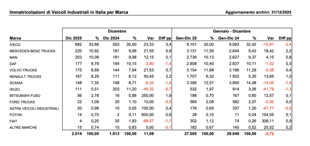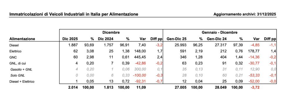 Nel 2025 le immatricolazioni dei veicoli industriali al di sopra delle 3,5 ton ha perduto il 3,72%, fermandosi a 27.005 veicoli contro i 28.049 del 2024. Il mercato rimane largamente presidiato dal diesel che, pur registrando una diminuzione complessiva del 4,85%, ha immatricolato 25.993 veicoli, pari al 96,25 del totale (contro il 97,39 dell’anno precedente).